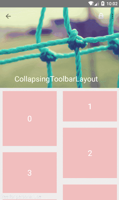1、在CollapsingToolbarLayout中设置了一个ImageView和一个Toolbar。并把这个CollapsingToolbarLayout放到AppBarLayout中作为一个整体。 在CollapsingToolbarLayout中,我们除了设置layout_scrollFlags,还可以设置一些其它的属性,简要说明一下: