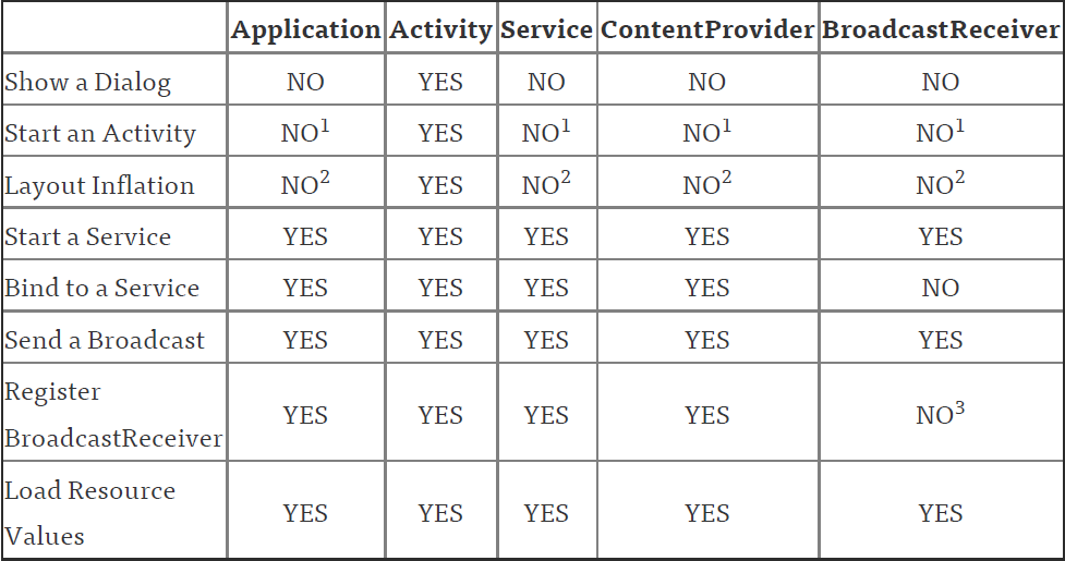 注:ContentProvider、BroadcastReceiver之所以在上述表格中,是因为在其内部方法中都有一个 context 用于使用。