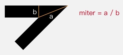 至于多尖的角才属于过于尖,尖到需要转为使用 BEVEL 来绘制,则是由 path 标签的属性strokeMiterLimit来设置的。strokeMiterLimit 参数是对于转角长度的限制,具体来讲,是指尖角的外缘端点和内部拐角的距离与线条宽度的比。也就是下面这两个长度的比: