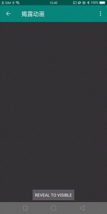 实例中,揭露动画的初始半径足够覆盖整个目标视图,所以初始时的视图是完全可见的。最终的半径设置为0,则表示动画结束后会隐藏目标视图。注意,当动画结束后要将目标视图的 visiblility 属性设置为INVISIBLE以提高性能。 最终效果如下: