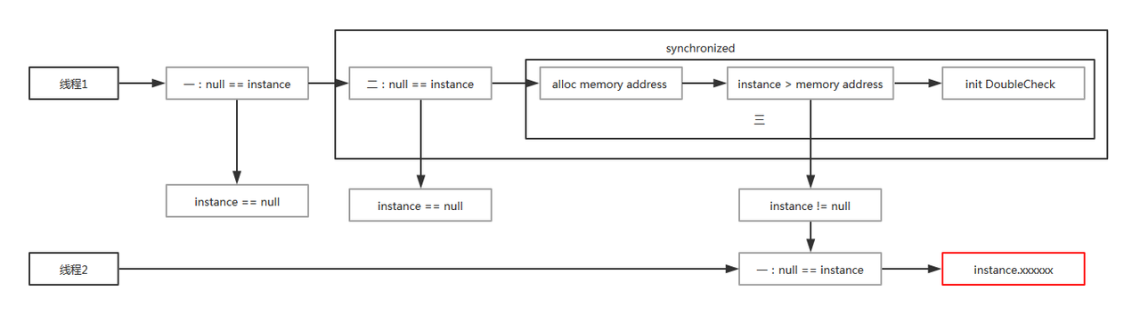 代码中步骤三并不是原子性的,可以分为三步: 3.1 为 DoubleCheck 在堆中申请一块内存空间(alloc memory address) 3.2 初始化对象 DoubleCheck(init DoubleCheck) 3.3 将申请的内存空间引用地址赋值给 instance 引用变量(instance > memory address) 在 JVM 看来3.2和3.3并不存在依赖关系,是有可能会重排序的,如果将3.2和3.3重排序: